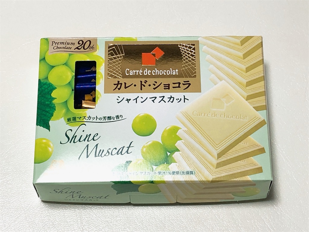 ホワイトチョコレートに、シャインマスカット。口どけるとクリーミーで、シャインマスカットのフルーティーさがふわっと香ります。ツンとくる甘みは、後味さっぱりしています。紅茶などにあうかも。